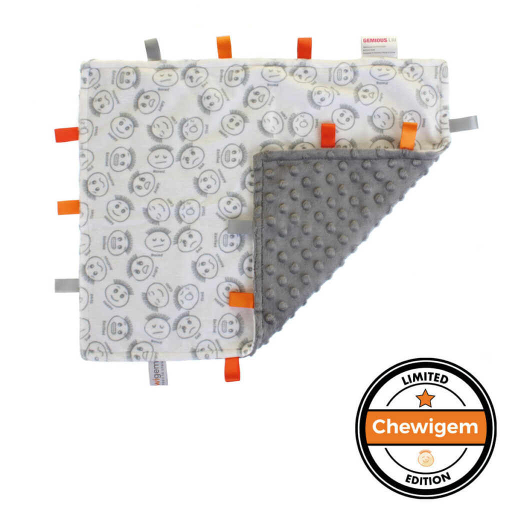 De ene kant van het Chewigem doekje is glad en de andere kant heeft nopjes om extra tactiele input te geven. Kortom een doekje met het beste van beide werelden. Het doekje is vormgegeven in stoer grijs met oranje labels. Labels zijn perfect om te friemelen om zo de zintuigen te prikkelen.