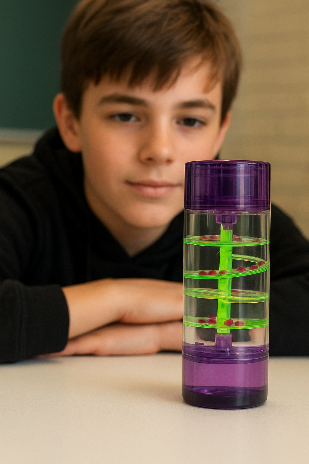 Bekijk de kleine vloeistof druppels die geleidelijk naar beneden draaien. Zodra de opvangbak aan de onderzijde is gevuld, kan de druppelbaan worden omgedraaid. Het schouwspel begint dan weer opnieuw. De visuele zandloper helpt jong en oud. Hij wordt veelvuldig ingezet bij mensen met prikkelverwerkingsproblemen zoals autisme om tot rust te komen. Heerlijk kijken naar de druppels die elkaar opvolgen heeft een namelijk een kalmerend effect en helpt de prikkels van de dag te verwerken.