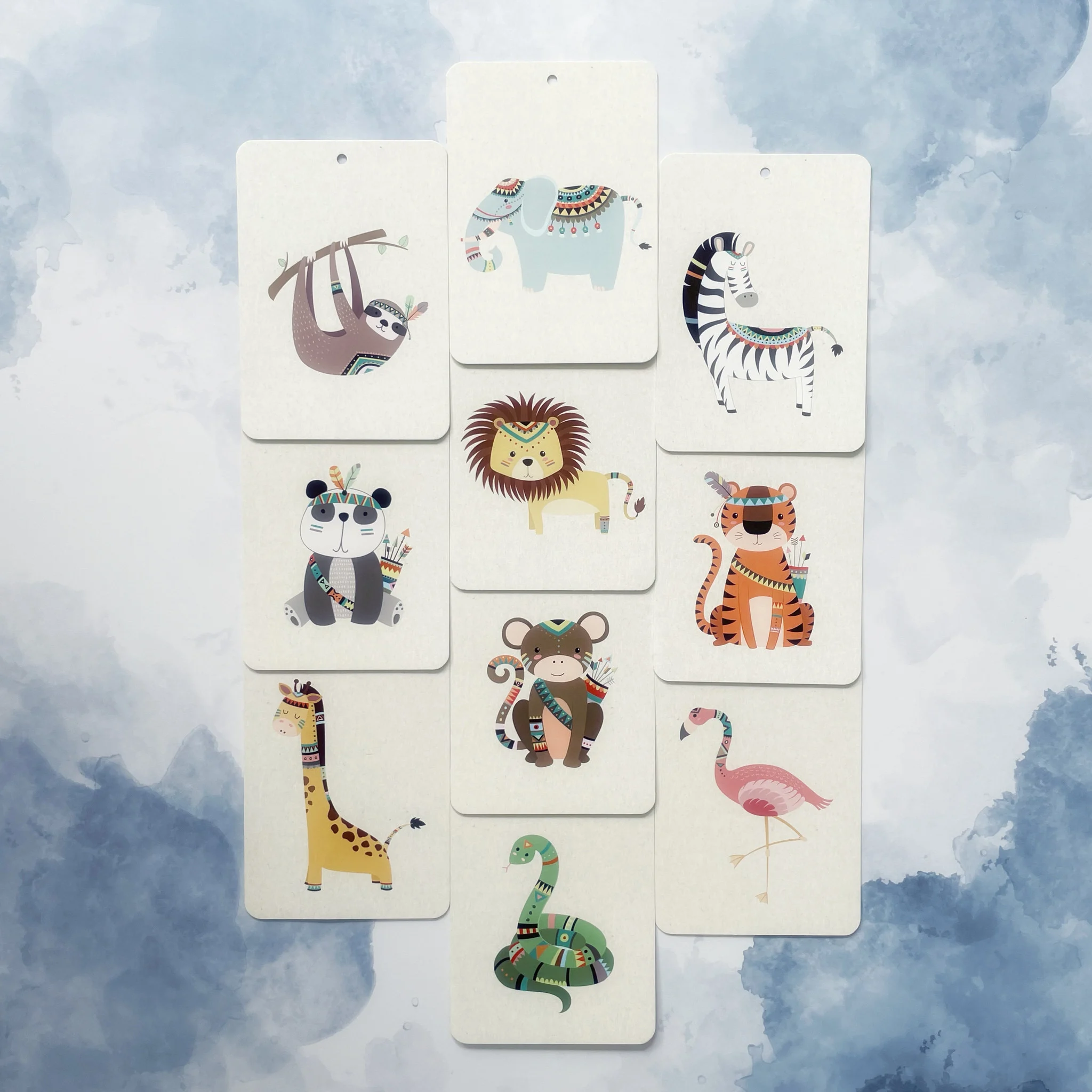 Het jungle friends-pakket biedt ouders 3 prachtige sets kaarten die gebundeld zijn met een koperen ring om ze op te bergen na het spelen: