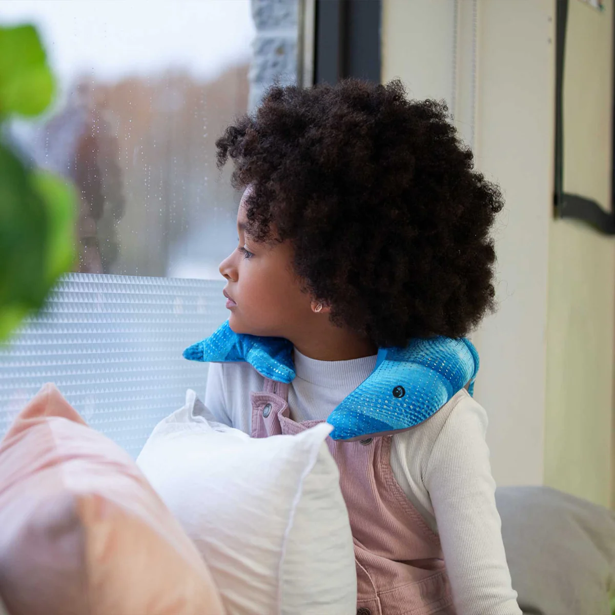 Dankzij de ronde, ergonomische vorm kan de dolfijn comfortabel op de heupen worden gelegd of zachtjes om de nek worden gedragen voor een ontspannend effect. Dit maakt hem ideaal tijdens momenten van rust, lezen, leren of ontprikkelen.