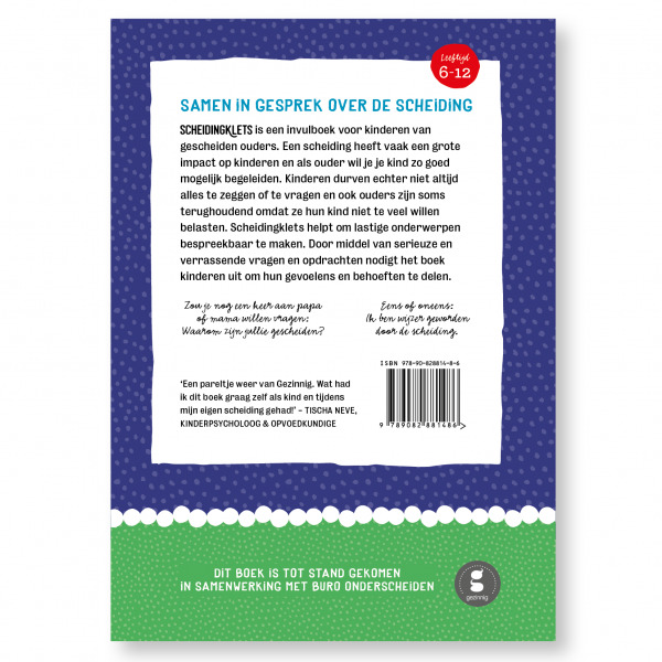 Scheidingklets is tot stand gekomen in samenwerking met Buro Onderscheiden. Geschikt voor kinderen van 6 tot 12 jaar. Kinderpsycholoog en opvoedkundige Tischa Neve: ‘Scheidingsklets kan voor ouders én kinderen een enorme steun en hulp zijn om de rollercoaster een beetje overzichtelijker te maken én kinderen een stem te geven in het hele proces. Een pareltje weer van Gezinnig. Wat had ik dit boek zelf als kind en tijdens mijn eigen scheiding graag gehad. Ik zal het veel ouders aanraden!’