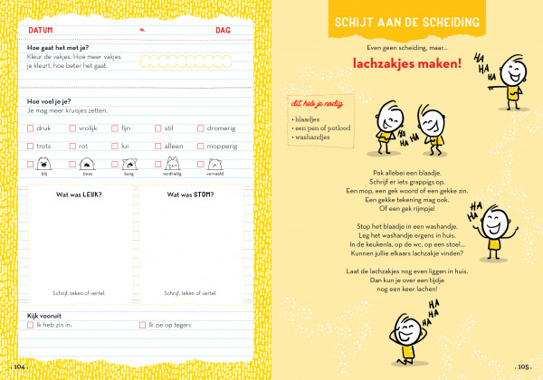 Scheidingklets helpt om lastige onderwerpen bespreekbaar te maken door middel van serieuze en verrassende vragen en opdrachten. Kind en ouder vullen het boek samen in: op een vaste dag in de week, bij een wisselmoment of gewoon als er behoefte aan is. Op elke linkerpagina kan een kind vertellen hoe het met hem of haar gaat. Op elke rechterpagina staan afwisselende opdrachten waarin zowel emotionele als praktische zaken aan bod komen zoals: Zou je nog een keer aan papa of mama willen vragen: Waarom zijn jullie gescheiden? Ben je het eens of oneens met de stelling: Ik ben wijzer geworden door de scheiding. Maak een lijstje met spullen die je niet meer heen-en-weer wilt slepen of een lijstje met dingen waarover je mee wilt beslissen. Scheidingklets biedt handvatten om samen in gesprek te gaan. Om te vragen of te vertellen wat misschien lastig of pijnlijk is. Maar ook om te delen wat al goed gaat, en om samen te kijken hoe je dingen fijner kunt maken.