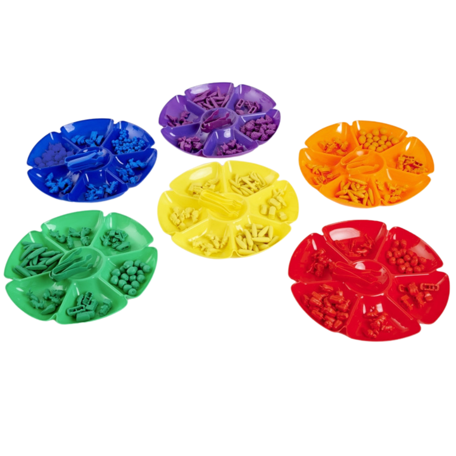 Set van 6 grote sorteerschalen in bloemenvorm. Deze grote schalen zijn ideaal voor alle tel-, sorteer- en classificatiewerkzaamheden. Leuk in combinatie met onze dieren sets (zoals de huisdieren). Maar de kunststof schalen zijn ook te gebruiken als verfbakje of voor het mengen van kleuren. Superleuk materiaal voor gebruik in de kinderopvang of de kleuterklas!