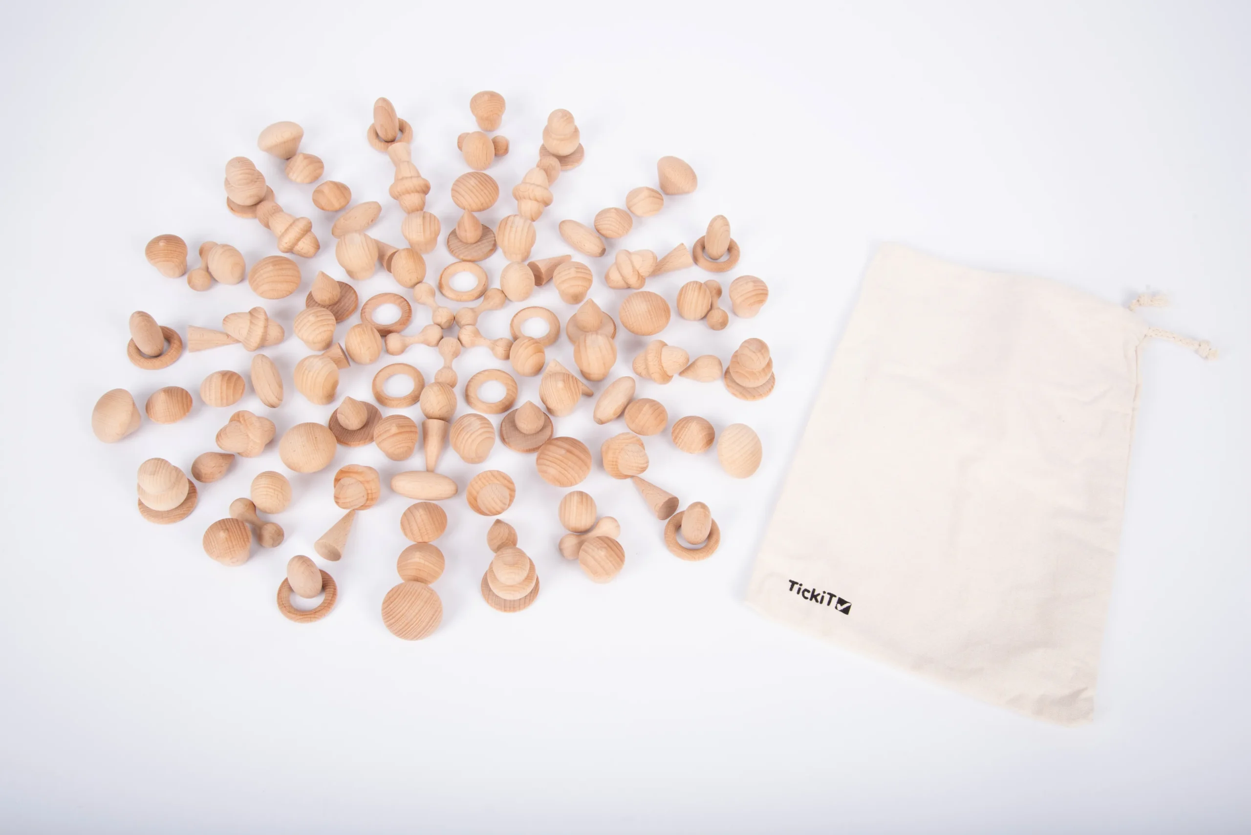 Het natuurlijk houten speelgoed van TickiT past bij heuristisch en montessori spel. De verschillende losse onderdelen bieden kinderen de mogelijkheid om op ontdekking uit te gaan. Onderdelen te gebruiken ook bij sensopathisch spel in bijvoorbeeld een sensory bin met rijst.