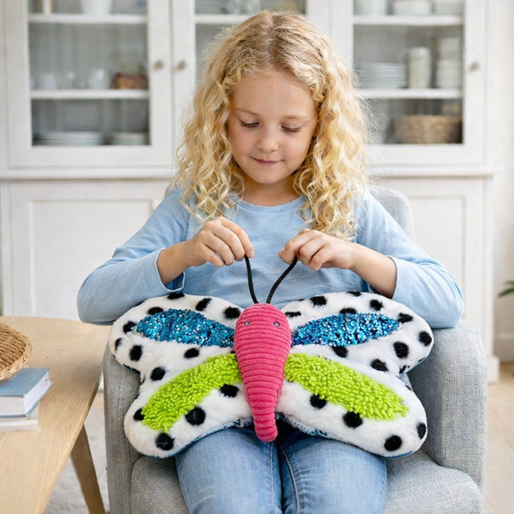 Dankzij de verzwaarde vulling geeft het kussen een zachte, gelijkmatige druk die kan helpen bij het verminderen van spanning en onrust. De vlindervorm nodigt uit tot vasthouden en biedt een veilig en geborgen gevoel. De verschillende stoffen en details stimuleren nieuwsgierigheid en sensorische ontdekking, terwijl de vrolijke kleuren zorgen voor extra visuele prikkeling.