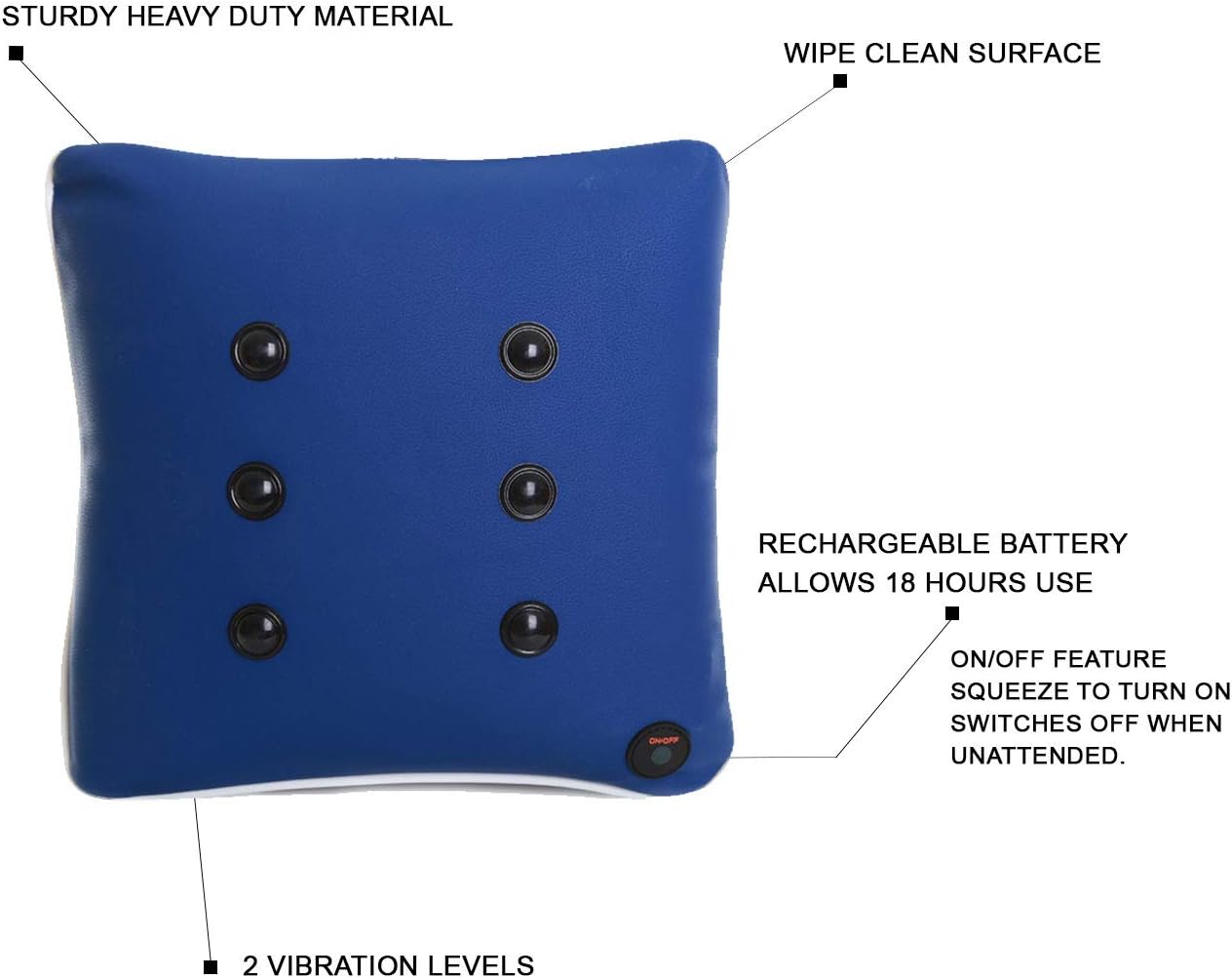 Het massagekussen is ontworpen om stress of angst te verminderen, kalmte te bevorderen en zintuiglijke stimulatie te bieden. Kinderen en volwassenen van alle leeftijden met sensorische problemen hebben er baat bij om op het kussen te zitten, erop te leunen of ermee te knuffelen, en de kalmerende trillingen te voelen.