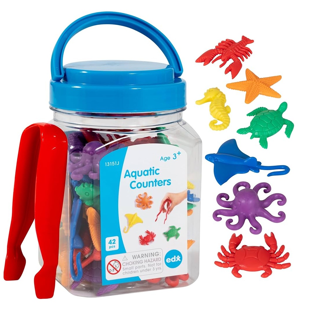 Waterdieren om te leren tellen en sorteren. Deze telmateriaal set bestaat uit 7 waterdieren: krab, kreeft, octopus, zeepaardje, zeester, pijlstaartrog en schildpad in 6 kleuren (rood, blauw, groen, geel, paars en oranje).
